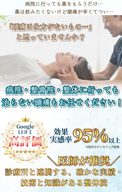 これまで多く症例を重ねてきた結果、病院や他院で改善されなかった方を含め、頭痛改善率は95%に達しています。